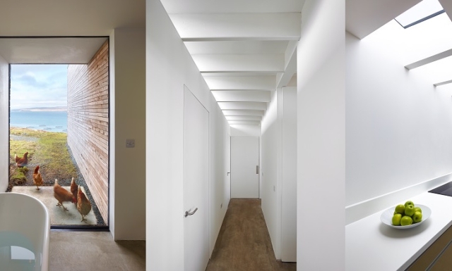 Kada posetioci prođu kroz ozidane i misteriozne ulazne sekvence, kuća se dramatično otvara sa panoramskim pogledima na more. Krovne grede su vidljive u enterijeru bele boje, boja koja namerno odabrana jer pojačava prirodno osvetljenje koje ulazi kroz prozore pune spratne visine. Polirani betonski podovi se nalaze u celom enterijeru, dodatno pojačavajući prirodno osvetljenje.