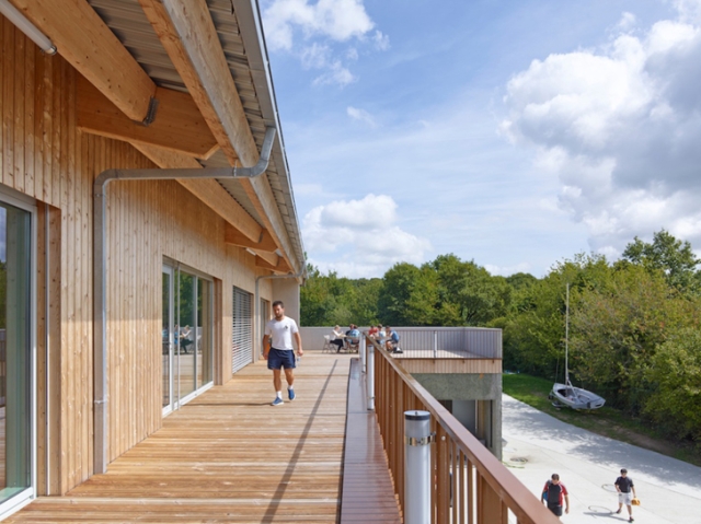 Prelepa kuća za čamce sa zelenim krovom, projekat arhitektonskog biroa Guinée-Potin Architectes, smeštena je na idiličnom jezeru Vioreau u zapadnoj Francuskoj. Drvetom obložena struktura je izgrađena tako da ojača i podrži uspešne sportske aktivnosti na vodi u ovoj oblasti, i ona donosi mnoštvo višenamenskih površina pod krovom pokrivenim travom. Kuća za čamce smešta svlačionice, skladišne prostore i učionice u ovom zelenom području.