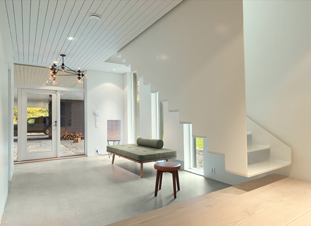 „Podijumski“ volumeni sadrže porodični skladišni prostor i porodičnu TV salu, koje su povezane sa gornjim prostorijama sa jedinstvenim stepeništem koje je projektovao Saunders lično. Otvorena dnevna soba i trpezarija su usendvičene sa glavnom spavaćom sobom na jednom kraju, i dečijom sobom na drugom kraju.