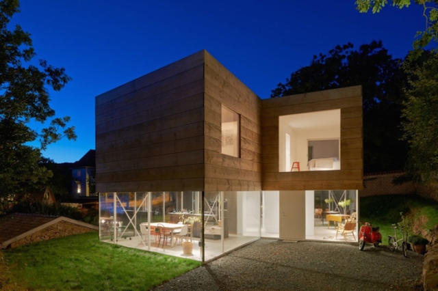 Dok je prvi sprat ove dvospratne porodične kuće obložen sa drvetom, celo prizemlje je umotano u staklo pune spratne visine.