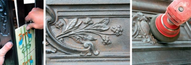 Ukoliko slojevi boja zaklanjanju dekorativne detalje na kaminima od livenog gvožđa ili drveta, primenite proizvode koji skidaju boju sa njih. Uklanjanje viška boje je uvek najbolje raditi na licu mesta kada su okolna područja dobro zaštićena. Vađenje kamina radi profesionalnog remonta može dovesti do oštećena i poremećaja dimnjaka, pa je to najbolje izbegavati ukoliko je moguće.