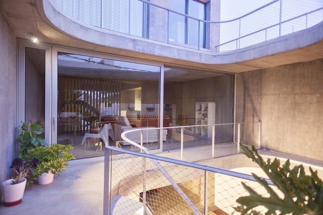 Konstrukcija je napravljena od lokalnih materijala - toplotna inercija betona se kombinuje sa toplinom drveta u zimskom dvorištu, i lakoćom stakla u letnjem dvorištu.