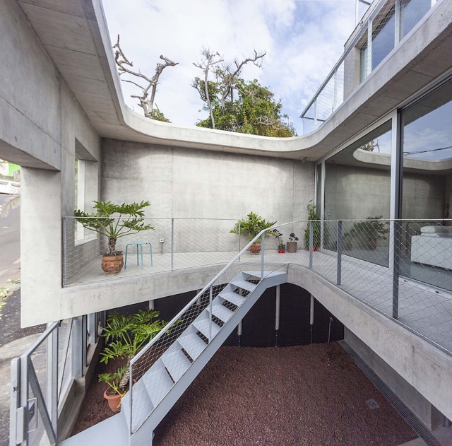 Različiti karakteri dvorišta su takođe izraženi u njihovoj materijalizaciji: jedno je napravljeno od drveta, a drugo od stakla i biljaka. Iluzija vizuelnog proširivanja prostora je postignuta pomeranjem naslaganih volumena istih širina, ali različitih dužina.
