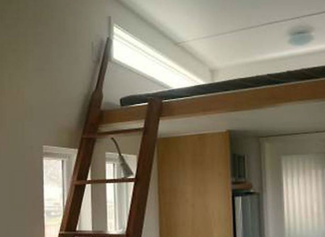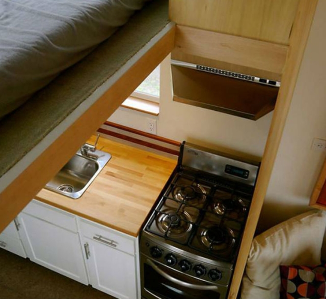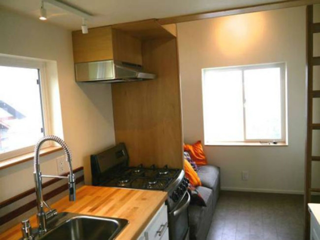 Teško je zamisli da je ovaj dom od samo 18 metara kvadratnih nekada bio prikolica, ali je infrastruktura prikolice olakšala postavku kućnih aparata i drugih predmeta unutra. U kući se nalazi ugrađeni skladišni prostor u dnevnoj sobi, i deo za spavanje iznad do koga se dolazi sa merdevinama.