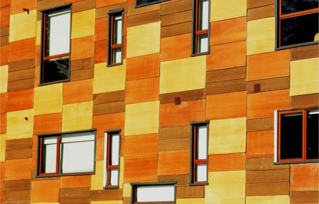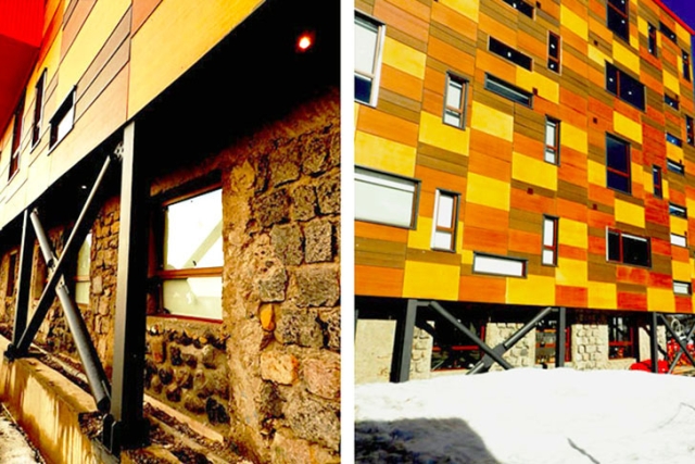 Alto Nevados hotel u Čileu je uglavnom napravljen od čelika i projektovan kao pikselizirani kutijasti volumen koji se ističe usred prelepih Anda. Njegova jedinstvena fasada je napravljena od starih drvenih tabli, spašene iz prethodnog hotela, koje stvaraju šareni pačvork u kombinaciji sa geometrijskim prozorima. Originalni kameni zid stvara kontrast sa modernom strukturom i pruža odličnu izolaciju.