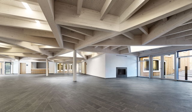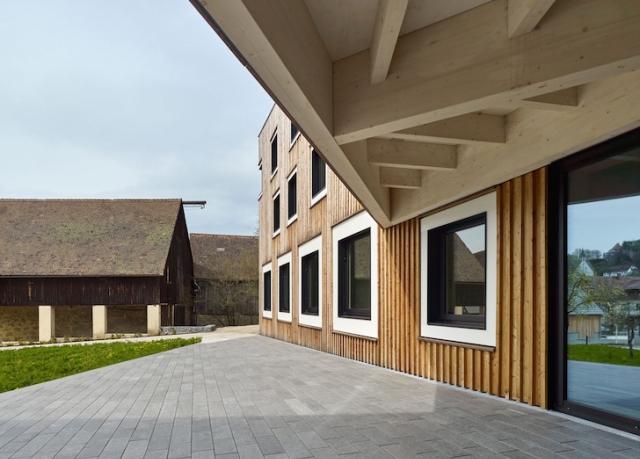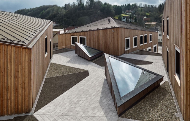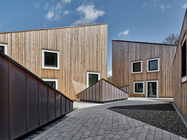 Smeštene na betonskoj podlozi, zgrade su obložene sa drvetom i završene sa bakarnim krovom. Fasada od ariša i krov od bakra će vremenom razviti prelepu patinu. Veliki kvadratni operabilni prozori različitih veličina buše fasadu zgrade na način da podsećaju na stare arhitektonske stilove koje vladaju u selu.