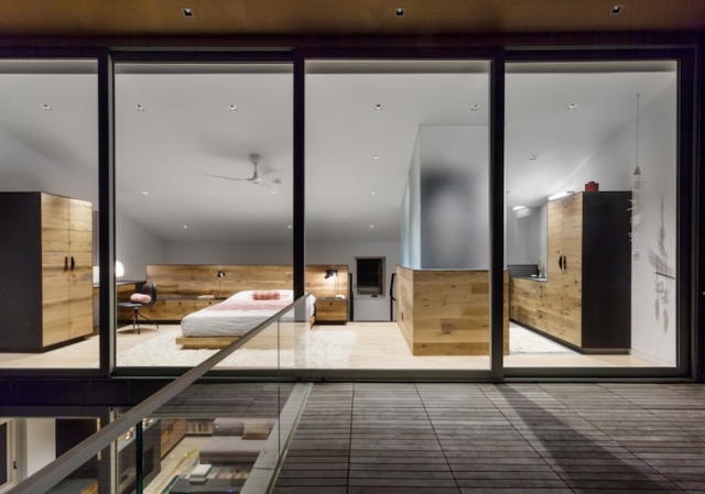 Unutar vikendice, zidovi su ostavljeni gotovo goli, omogućavajući različitim materijalima i teksturama unutrašnjih elemenata dolazak do izražaja. Reciklirano drvo je korišćeno u enterijeru i za kamin, a čelik je korišćen za izradu stepeništa.