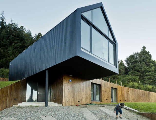 Gornji, arhetipski volumen smešta zajedničke stambene prostore ispod crno obojene metalne fasade. Na oba kraja ovog otvorenog prostora staklo uokviruje Ande, stalno podsećajući ukućane na sveto mesto na kome se nalaze.