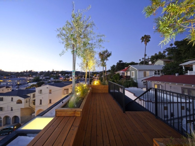Kao rezultat toga, prirodno osvetljenje prodire u sva tri nivoa kuće koja je obložena sa elegantnom, ali minimalističkom serijom nameštaja i podova od prirodnog drveta. Krovna bašta poseduje stabla masline i pruža poglede iznad gustog urbanog pejzaža sve do holivudskog znaka i obližnjih planina San Gabrijel.