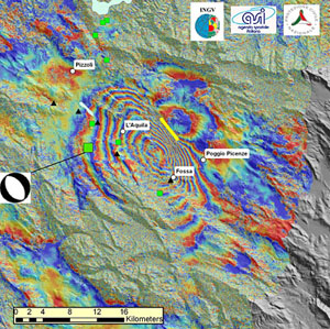 Na portalu Evropske svemirske agencije - ESA (European Space Agency) objavljeni su satelitski snimci i interferogram (prikaz interferencije - uzajamnog uticaja talasa, slika levo) koji je uradio italijanski Nacionalni institut za geofiziku i vulkanologiju - INGV (Istituto Nazionale di Geofisica e Vulcanologia) uz pomoć ASAR-a (Envisat Advanced Synthetic Aperture Radar).