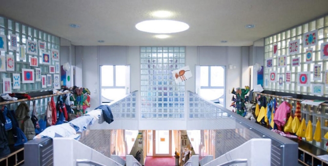 Njene velike oči su zapravo prozori koji pružaju obilje svetlosti dvospratnoj unutrašnjosti. Mačkin stomak smešta svlačionicu, trpezariju, kuhinju i učionice koje su ukrašene sa šarenim dečijim crtežima.