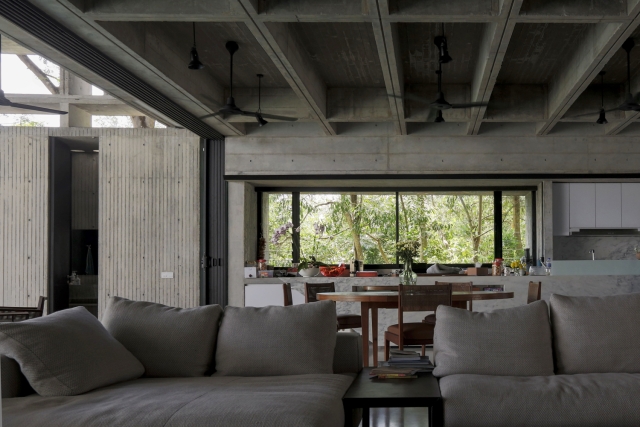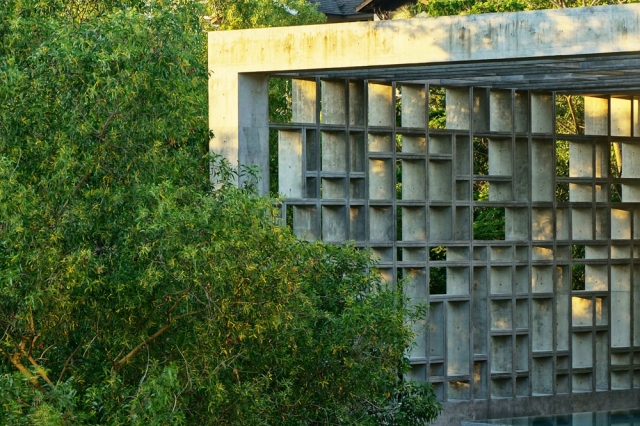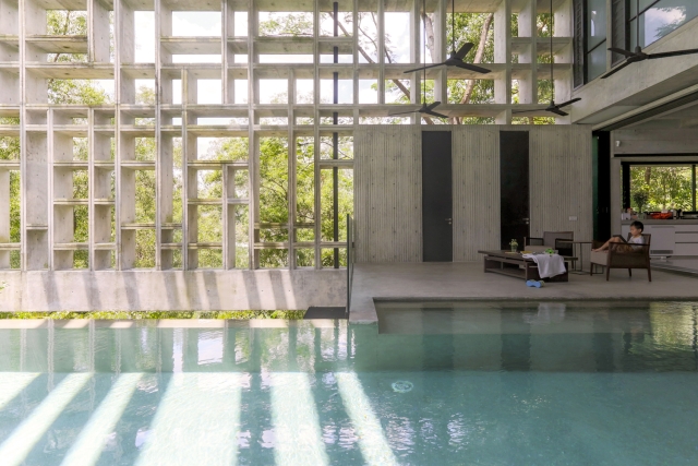 Kontrola unutrašnjih temperatura je važan faktor prilikom projektovanja kuća u tropskim područjima. Kako bi se izborio sa žestokim suncem na održivi i ekonomični način, arhitektonski biro WHBC je projektovao zanimljivu betonsku fasadu nepravilne pravougaone mreže koja se proteže od tla i dostiže plafonse kuće.