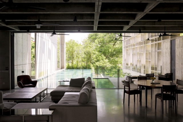 Kuća je projektovana od strane arhitektonskog biroa WHBC Architects, a njena betonska fasada integriše unutrašnje prostore za bujnim zelenilom i cvećem, omogućavajući porodici da uživa u flori u prirodnom hladu. Perforirani betonski omotač kuće blokira jako tropsko sunce, podstičući rast biljaka u šupljinama.