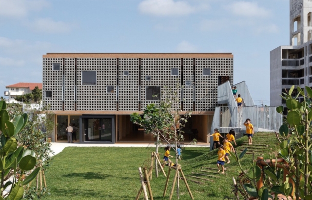 Dvospratna zgrada koristi konstrukciju od betona ojačanog čelikom koja može da izdrži dramatične uslove tajfuna. Šuplji betonski blokovi su naslagani tako da formiraju zidove koji štite dvorišta i prozore, omogućavajući protok vazduha kroz kompleks i čuvajući poglede na okolinu, dok štite decu od sunca i kišom nanesenih ruševina. Crvene keramičke pločice su korišćene na zidovima kako bi uklopile objekat sa tipičnim krovovima od crvenih crepova na ostrvu.