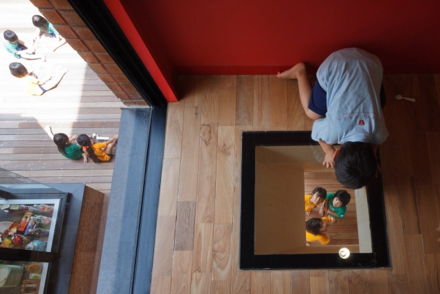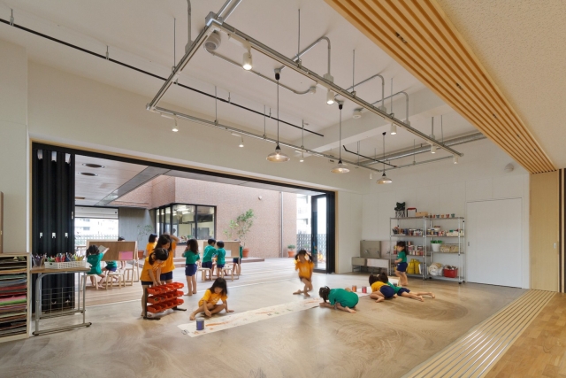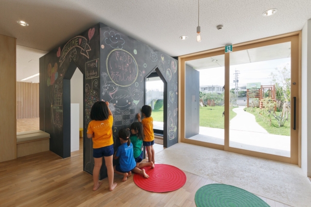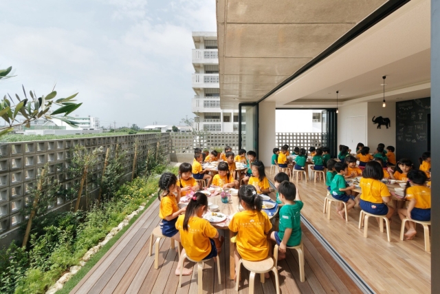 Arhitektonski biroi Hibino Sekkei i Youji no Shiro, koji su specijalizovani za arhitekturu objekata za decu, koristi lokalne materijale, kao što su betonski blokovi sa rupama i crvene zidne pločice, za zaštitu dece od jakih kiša i letećih ruševina koje često prate tajfune.