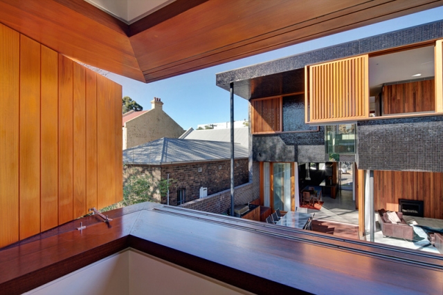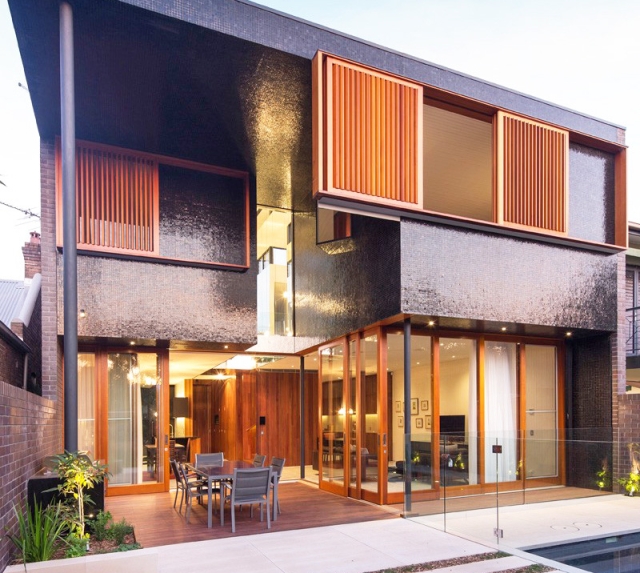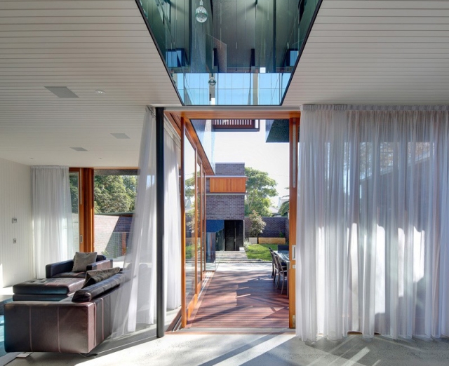 Sa dvorišne strane, kuća ima niz konzolnih volumena i staklenih zavesa koje stvaraju dijalog koji naglašava kretanje između enterijera i spoljašnje bašte i dvorišta. U prizemlju se nalazi kuhinja i dnevna soba koje su spojene sa kliznim staklenim vratima, koje se otvaraju ka spoljašnjoj trpezariji, zaštićenoj od kiše sa debelim isturenim krovom iznad drugog nivoa.
