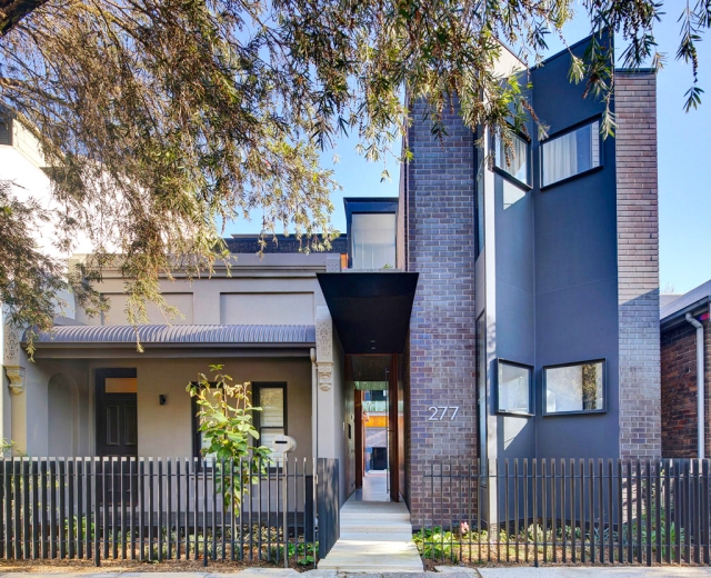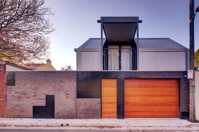 Gledano sa ulice, kuća deluje kao da ima dva volumena, povezana sa ulaznim delom sa velikom isturenom nadstrešnicom. Sa leve strane se nalazi volumen tradicionalnog izgleda koji se stapa sa modenrim dvospratnim volumenom od cigle sa desne strane, koji je proširen sa ugaonim oblikom nalik harmonici od stakla. Ova mešavina je ujedinjena i unapređena u zadnjem delu kuće.