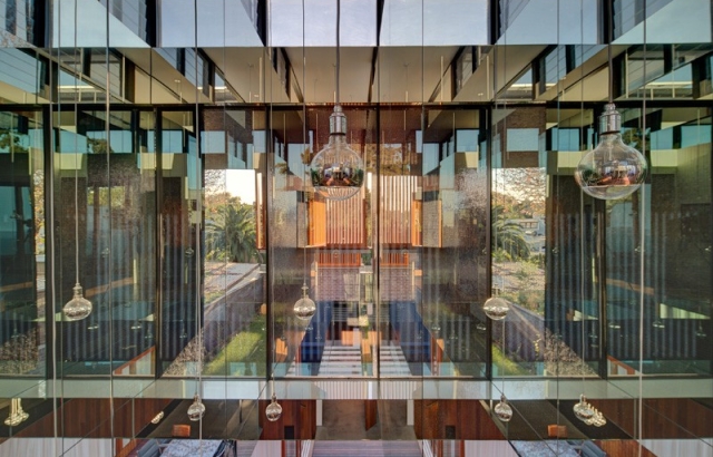 Velike staklene zavese su sastavni deo funkcije ogledala u kući, koje stvaraju različite svetlosne obrasce tokom dana. Visoko polirani betonski podovi prirodno izoluju kuću i takođe deluju kao odražavajući element za ovu bogatu svetlost.