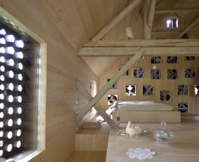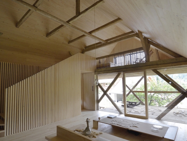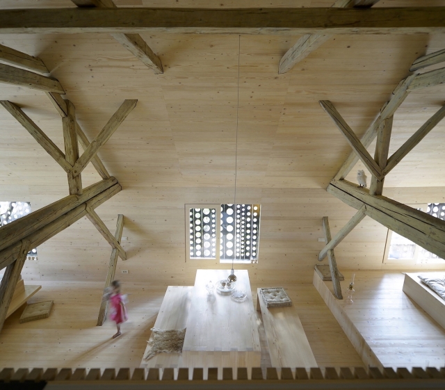 Za razliku od stare i tamne drvene fasadne obloge i tradicionalnog krova sa betonskim škriljcima, enterijer je svetao i savremen. Svi zidovi, podovi i nameštaj su izgrađeni od lokalne smreke.