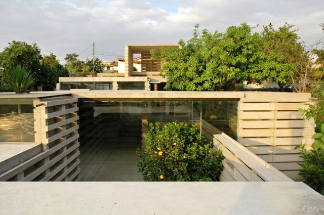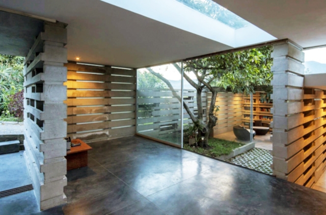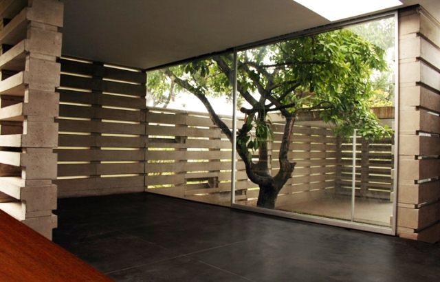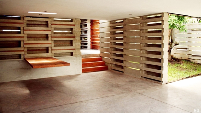 Naslagani betonski blokovi su ostavljeni sa prazninama u masi u nekim oblastima kako bi se stvorili polu-transparentni zidovi koji filtriraju dnevno osvetljenje i uvlače pejzaž u enterijer.
