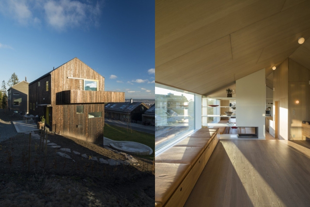 Prednji i zadnji deo kuće ima slične fasade, sa mešavinom prozora sa žutim ramovima koji pružaju svakoj strani drugačiji izgled, obezbeđujući stanarima nesmetane poglede na grad i šumu. Kuća, koja je veća od svojih suseda, je projektovana tako da se ističe ali i da se uklapa sa okolinom uz pomoć svog kosog krova i drvene fasade.