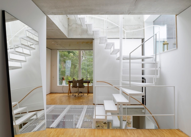 Dva sprata su povezana sa centralnim spiralnim stepeništem, koje vode do dve spavaće sobe. „Enterijer je skoro jedna kontinuirana soba“, kažu arhitekte. „Jedinice su postavljene tako da stvaraju malene privatne prostore u okviru ove velike sobe.“ Ako se nastavi dalje uz stepenice, dolazi se do krovnog vrta sa biljem i travama.