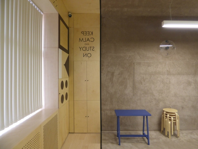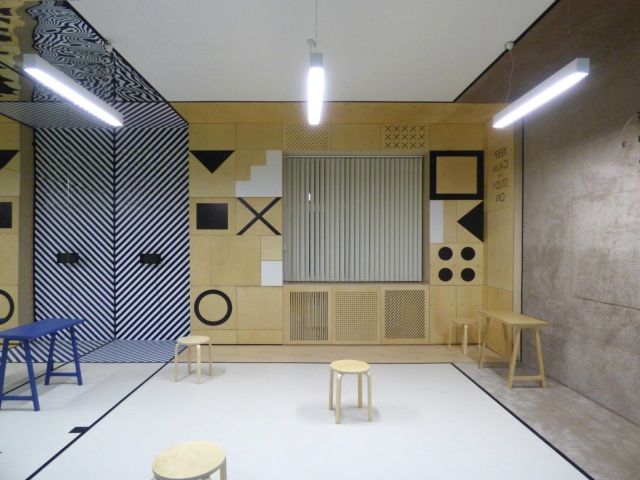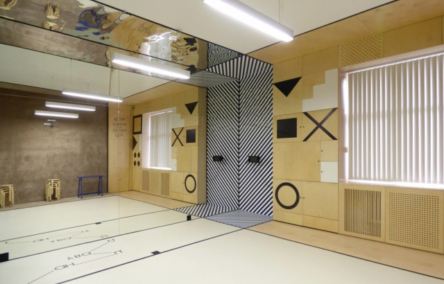 Multifunkcionalni prostor kombinuje učionicu, igraonicu, plesnu sobu i muzičku sobu u jednom prostoru. Svaka oblast se odlikuje sa individualno dizajniranom grafikom. Iako prostor deluje čudno i nelogično na prvi pogled, zidno ogledalo pomaže u određivanju prostornih granica i upotrebe prostora.