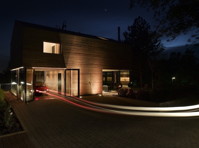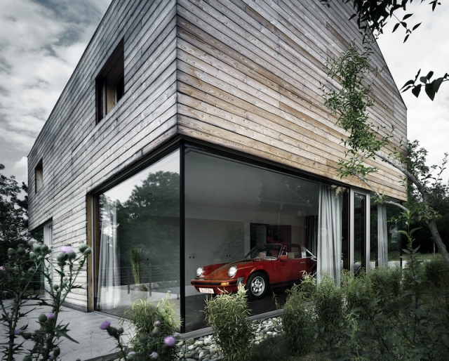 Jedna staklena ispuna u prizemlju smešta vlasnikov Porše, koji je izložen na taj način kao neka drevna ikona. Druga staklena ispuna smešta otvorenu dnevnu sobu, sa velikim prozorima na tri strane koji omogućavaju prodor zelenila i prirode u prostor.