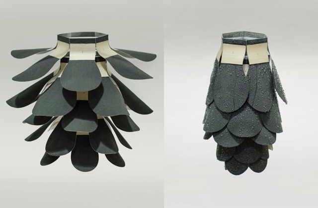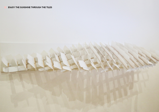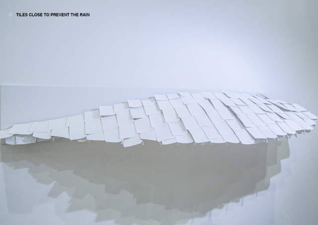 Dakle, kako bi ovaj proizvod mogao da se koristi? Čen je razvio tri prototipa za početak. Prvi je sklonište prekriveno u pločama napravljenim od ovog materijala. Ploče se krive i otvaraju prilikom suvih vremenskih uslova kako bi propustile svetlost i vazduh u strukturu, ali kada se pokvase one se ravnjaju kako bi zaštitili stanare od kiše.