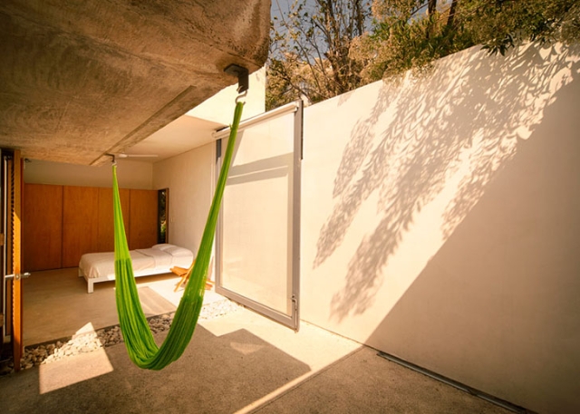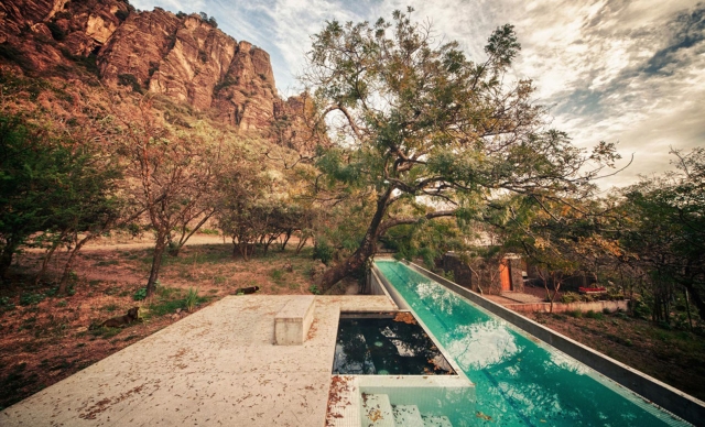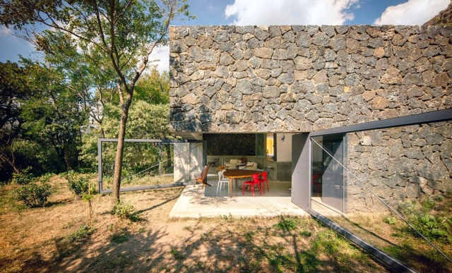 Arhitektonski biro EDAA iz Meksiko Sitija je projektovao ovu rustičnu zgradu od vulkanskog kamena kao vikendicu za stariji par, uklapajući poglede na obližnji drevni Astečki hram u novu strukturu.
