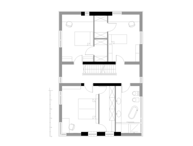 Prizemlje je podeljeno u zajedničke oblasti za porodicu, poput dnevne sobe, trpezarije, kuhinje, gostinje sobe i igrališta. Spavaće sobe porodice su premeštene na prvi sprat, gde su privatnost i udobnost bili ključni za projektovanje ovih oblasti.