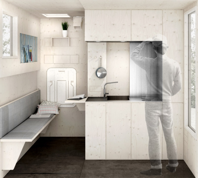 Kako bi se što više povećao unutrašnji prostor, nameštaj može biti sklopljen i upakovan u zidove mikro jedinica. Pojedini objekti će morati da se dele u zajednici ovakvih kuća, kao što su objekti za zajedničko tuširanje, na primer. Predložene jedinice su pokrivene sa solarnim panelima i napravljene od šperploče i čelika.