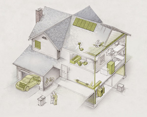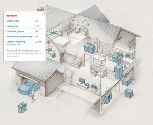 Na sajtu Nacionalne geografije objavljena je kratka slikovita prezentacija potrošača električne energije u prosečnom domu u SAD i njihov uticaj na emisiju CO2 u atmosferu. Prosečna kuća u Srbiji ima verovatno nešto manji uticaj na okolinu usled slabije opremljenosti, ali u nekim delovima potrošnja je i veća zbog zastarelih rešenja grejanja i sl.