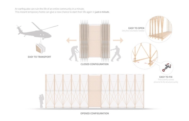 Nakon što je zemljotres, ranije ove godine, pogodio Nepal, italijanska firma Barberio Colella ARC je projektovala sklonište za slučaj katastrofe, nazvan „Just a Minute“, namenjen raseljenim Nepalcima. Iako će najverovatnije ostati samo na papiru, ovaj projekat predlaže sklonište sa prilično interesantnim idejnim rešenjima, poput strukture koja se razvlači i tako podseća na harmoniku, što bi, navodno, trebalo da olakša transport.
