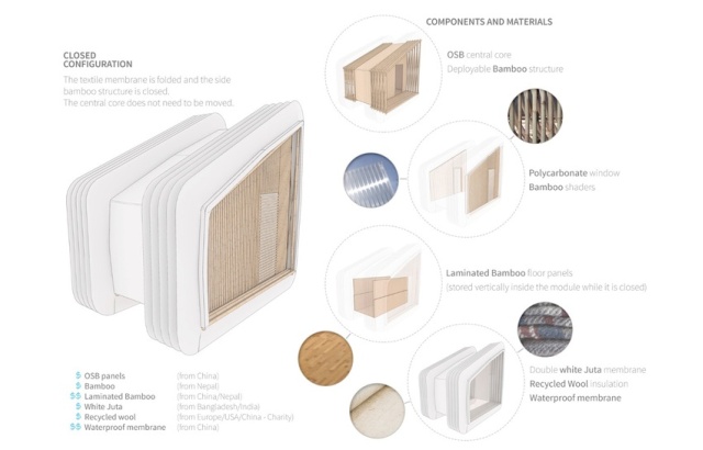 Sklonište čini centralni deo izrađen od čvrstih OSB ploča, u kojem je smešten prostor za kupatilo i kuhinju, i prostorija za spavanje i boravak, smeštenih sa strane. Ove druge prostorije bi bile izgrađene uz pomoć okvira od bambusa i pokrivene vodootpornom membranom.