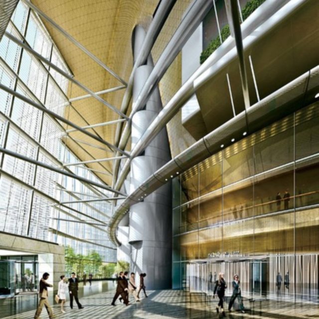 Unutrašnjost zgrade uglavnom čini moderni poslovni prostor, sa prodajnim mestima i hotelskim sobama ali i vidikovcem/kulturno uređenim prostorom za posmatranje na vrhu zgrade. Poseduje LEED standard (standard za zelenu zgradu) i ima neke od karakteristika dizajna i tehnologije energetski efikasne zgrade.