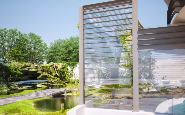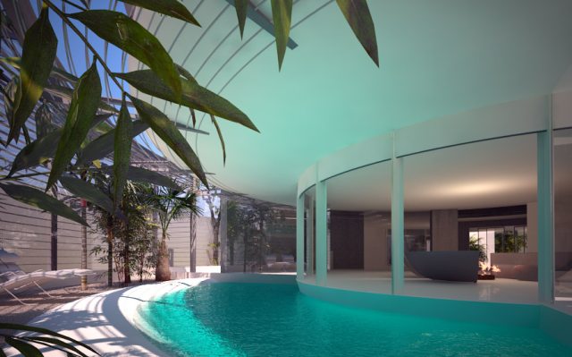 U centralnom delu prizemlja se nalazi dnevna soba, sledeća kriva obuhvata kuhinju, bazen i spoljnu terasu. U narednoj i poslednjoj krivi su spavaća soba i staklena bašta u senci metalnog horizontalnog otvora. Na prvom nivou su spavaće sobe, garderobne sobe i kupatila radijalno raspoređene od jezgra, gde je postavljena dvospratna biblioteka. Šablon se ponavlja u suterenu, gde je jezgro okruženo tehničkim prostorijama, tačnije tu su podrum i prostor za organizovanje zabava.