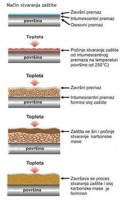Komponente u premazu, već na relativno niskim temperaturama (150-180°C), reaguju i pri tome oslobađaju gasove koji (na temperaturi od oko 250°C) izazivaju ekspanziju premaza. Novoformirana masa je dobar izolator koji garantuje stabilnost konstrukcije ili pratećeg elementa. Na taj način će oni vršiti svoju ulogu (stabilnost konstrukcije ili odimljavanje prostora) u vremenu predviđenom za evakuaciju i dolazak vatrogasnih ekipa na lice mesta.