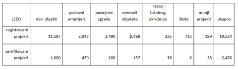 - preko 450 miliona kvadratnih metara poslovnih objekata uključeno je u LEED sistem sertifikacije