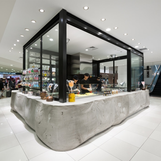 Većina nedavnih eksperimenata sa tekstilnim oplatama za livenje betona je stvorilo složene oblike nalik mrežnim. Ali japanska firma Schemata Architecture Office je izlila beton u tekstilnu oplatu nalik da bi kreirala ovaj glomazni pult za konditorski kiosk u Tokiju.