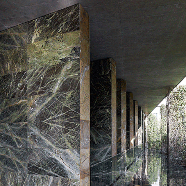 Staklo okružuje celu građevinu, ali gotovo svi od tih prozora-zidova su iza mermernih ploča. To stvara terasni prostor uz ivice zgrade.