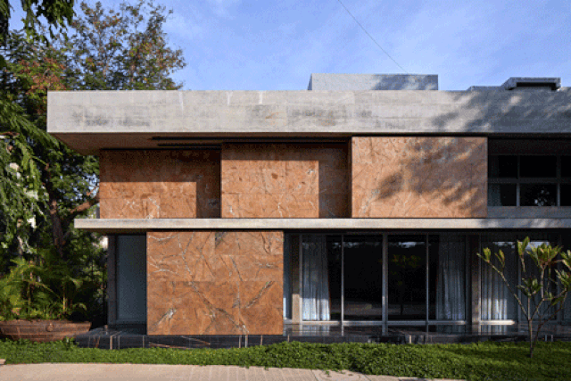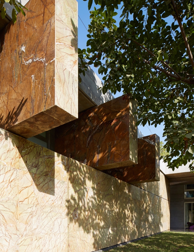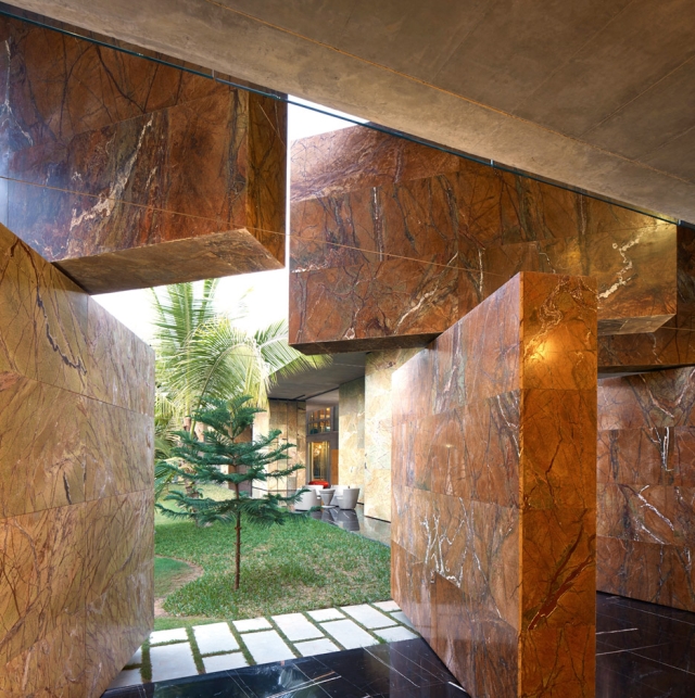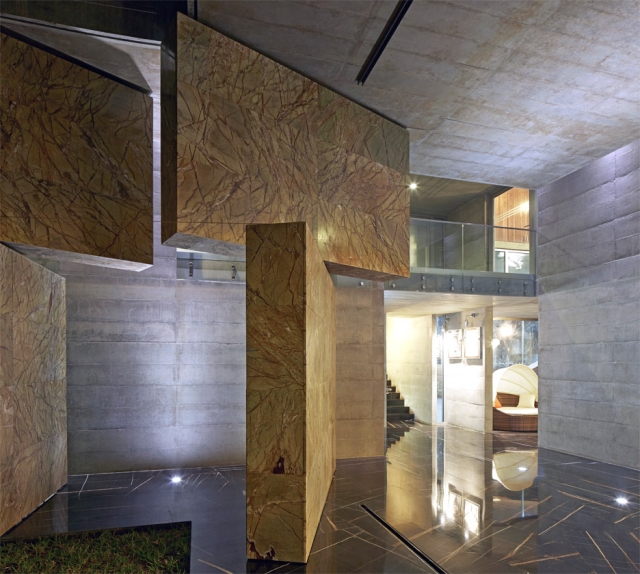 Na dodir dugmeta, masovni mermerni zidovi koji okružuju ovu kuću u Indiji razdvajaju se na rotacione i klizne panele, otkrivajući iza laganu staklenu fasadu.