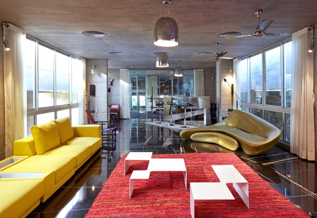 Ovi prostori su uglavnom popunjeni italijanskim nameštajem, ali postoji barem barski sto koji je dizajniran posebno za kuću od strane arhitekata. Dizajniran tako da izgleda kao „Möbius strip“, napravljen je od nerđajućeg čelika.