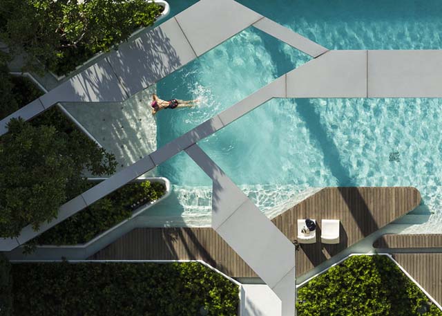 Nadstrešnica od betonskih okvira čini da ovaj krovni bazen u Bangkoku izgleda kao da je izrezan, sa pogledom na Tajlandske predele arhitekte iz firme T.R.O.P. su ga postavile na 42-spratni stambeni kompleks u neposrednoj blizini glavne gradske stanice. Više o ovome pogledajte ovde.