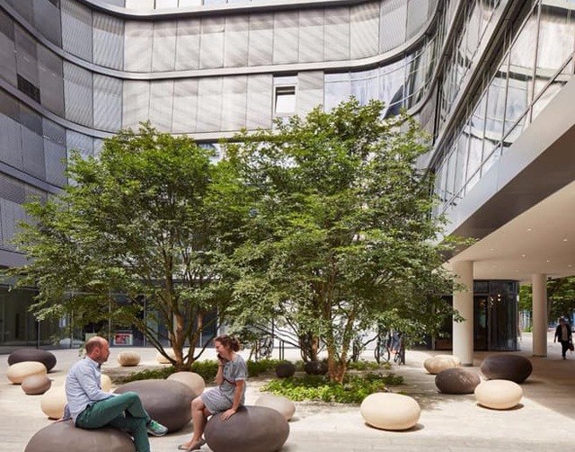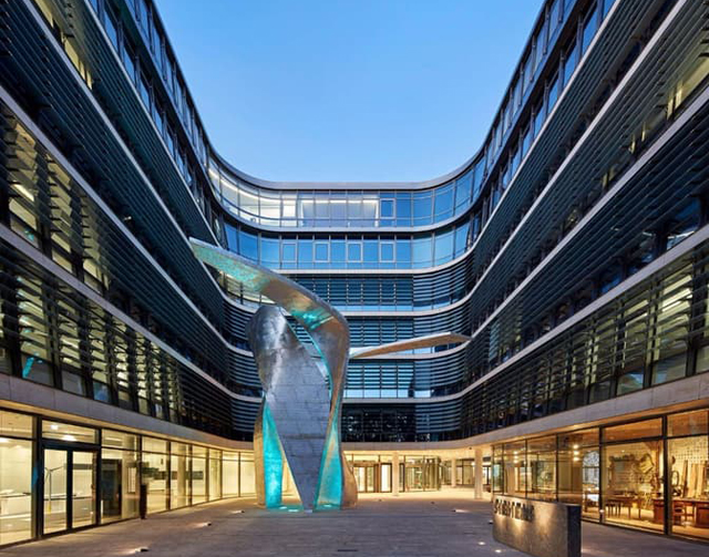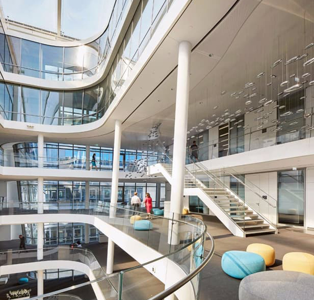Raspored omogućava zaposlenima kojih je 1200 da imaju vizuelni kontakt jedni sa drugima preko dvorišta, a tu su i prostori za odmor gde se mogu razmeniti informacije i sklopiti saradnja kao i mirna zona za neometani rad. U svim radnim prostorijama se nalaze prozori od poda do plafona, što im omogućava da budu ispunjeni prirodnom svetlošću. Dok je nagnuta unutrašnja fasada takođe projektovana kako bi se omogućilo da ulazi dovoljno prirodnog svetla u zgradu i da se smanji potreba za veštačkim osvjetljenjem.