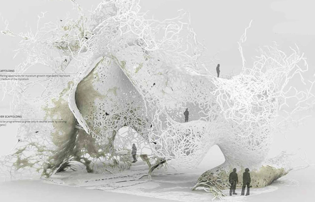 Kroz projekat „Hybrid Fibrous Morphologies“ Ruxandra Gruioniu nastoji da stvori novi bio-integrativni sistem materijala od pečuraka. Gruioniu je eksperimentisala sa spajanjem živih i neživih materija da bi stvorila troškovno i energetski efikasno arhitektonsko rešenje koje podseća na biološki model. Pečurke su vrlo jednostavni višećelijski mikroorganizmi koji se sastoje od brojnih vlakana koja imaju sposobnost da se granaju i da se ponovo međusobno povežu kako bi formirala biološki transportne mreže preko veštačke strukture, kao što su metalne rešetke.