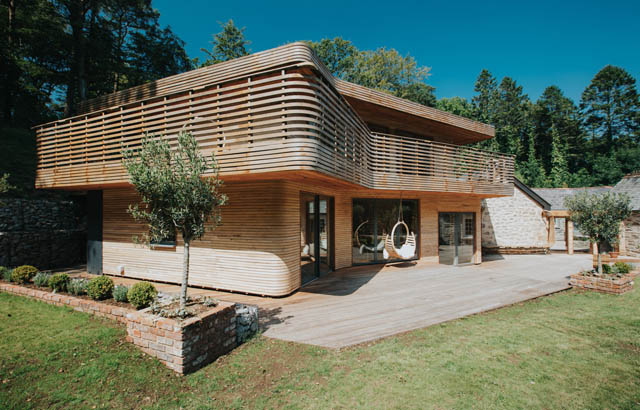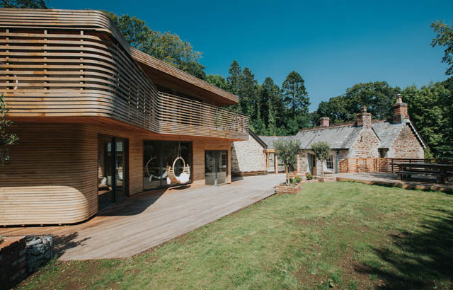 Dizajneri nameštaja Tom i Danielle Raffield su koristili parom savijeno drvo da bi pokrili deo lovočuvareve kućice u „Cornish Woodlandu“.