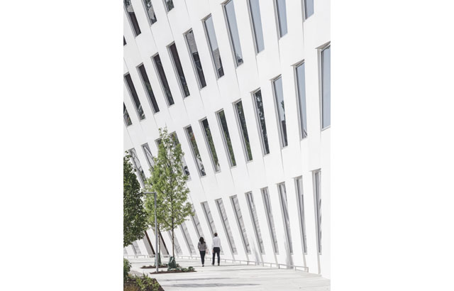 Glavna fasada se sastoji od prefabrikovanog betonskog zida koji se krivi ka unutra. Izvajani oblik odgovara „udaru talasa" kružne staze parka, okolnom području i zasađenim biljkama.