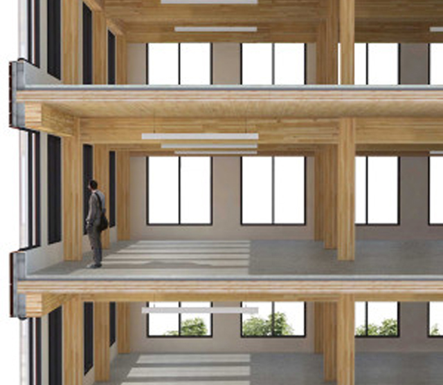 Drvena konstrukcija je je takođe pogodna kao materijal za unutrašnjost zgrade. Poslovne zgrade obično prikrivaju delove svojih konstrukcija iza gipsanih ploča i akustičnih ploča jer ne cene svi koji tu rade i dolaze, izgled izloženog betona ili čelika. Iako je njena spoljašnjost „presvučena“ čelikom, njegovu unutrašnjost čini jednostavan drveni okvir. „Čitava drvena konstrukcija „T3“ će biti izložena i osvetljena u određenom procentu sa unutrašnjom rasvetom usmerenom ka plafonu", kaže Nichol. Noću će osvetljeno drvo sijati slično kao fenjer. Prizemni nivo sa drvenim nameštajem, štandovima i stepenicama će omogućiti javnosti da doživi zgradu.