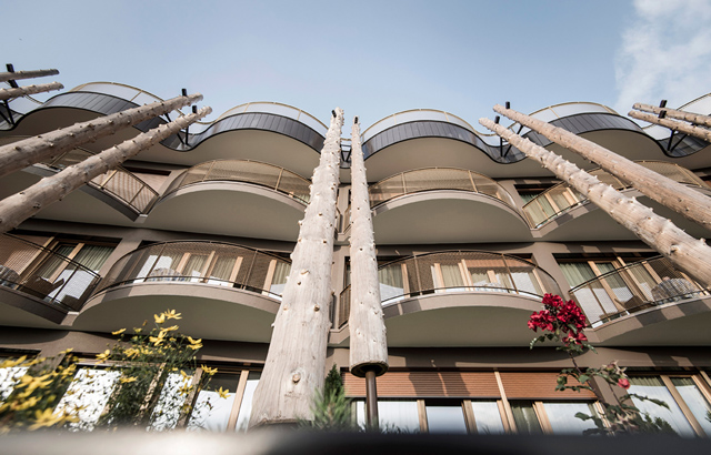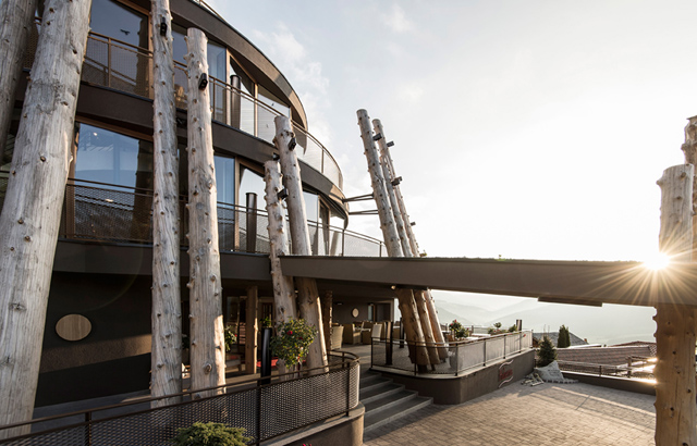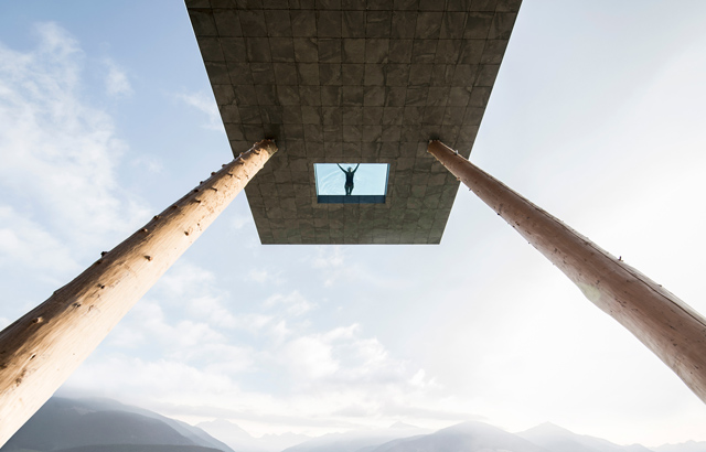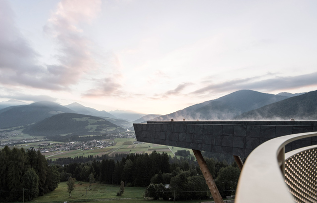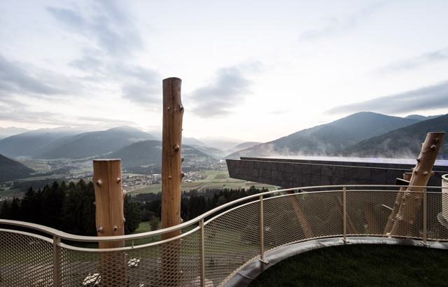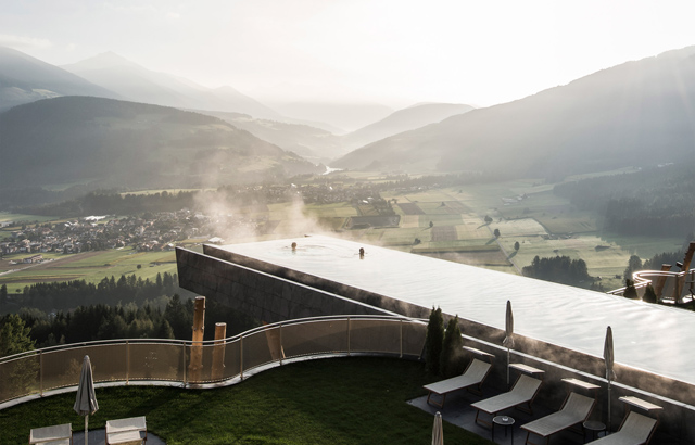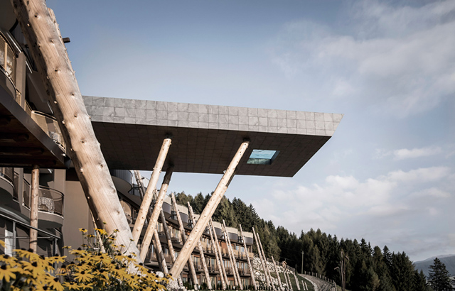 Stakleni panel koji se nalazi u osnovi konzolnog bazena daje kupačima dramatičan pogled na južnotirolske Dolomite. Projektovala ga je arhitektonska firma NOA.